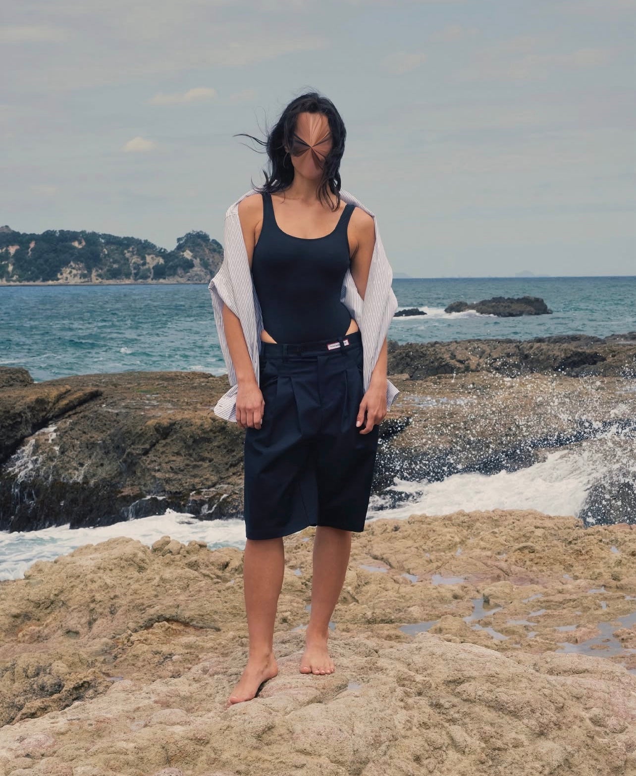 Tailored Shorts in Midnight Navy. Crafted from a premium fabric blend, these shorts offer a polished fit with gentle front pleats and a streamlined waistband. Featuring a subtle cut-out detail, they blend sophistication with a relaxed costal vibe.