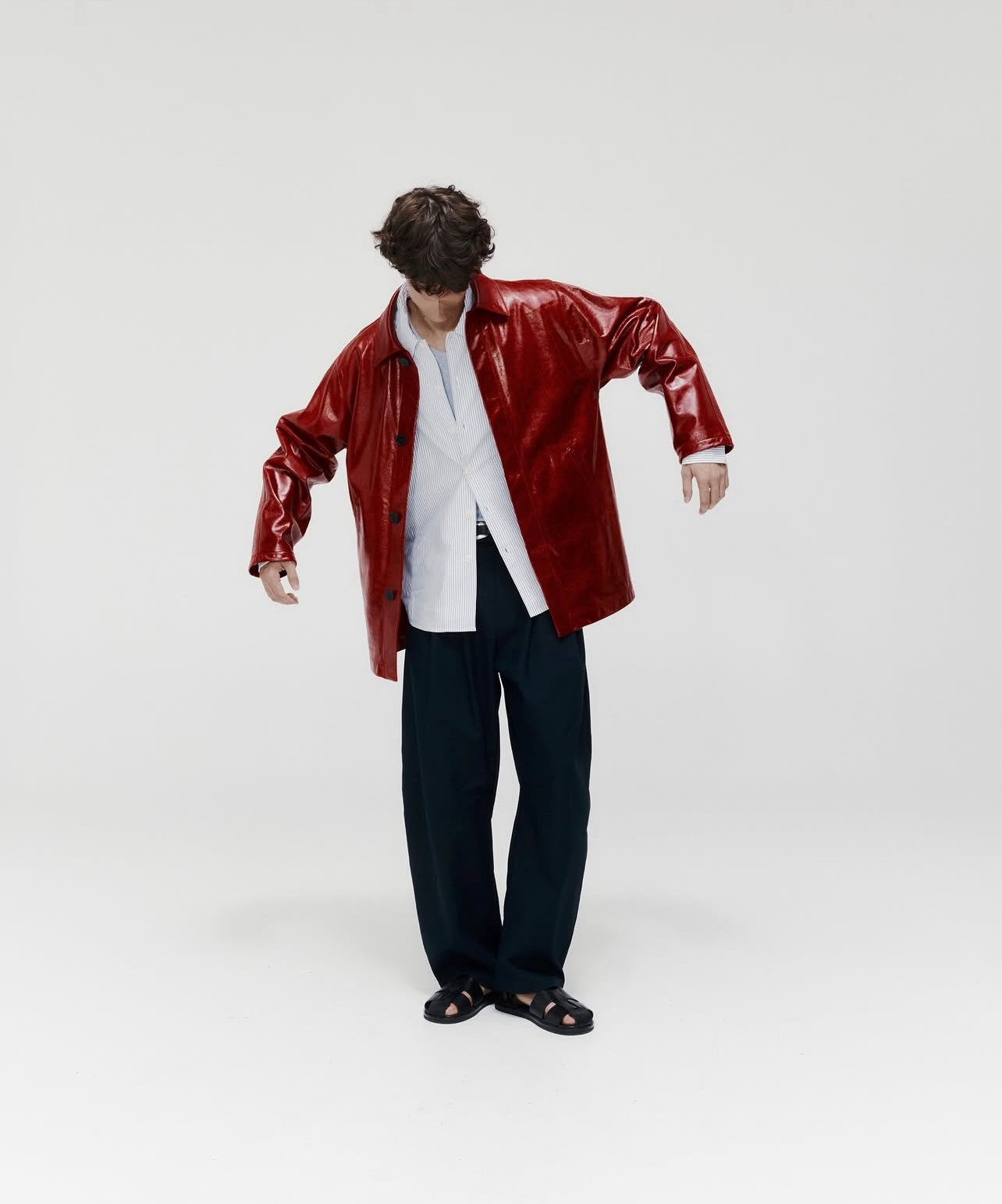 Patent Leather Coat in Crimson Shine. Crafted from glossy patent leather, this coat features a bold, structured silhouette with a notched collar and smooth button closures. Its striking red hue and sleek finish make it a standout piece, blending modern edge with classic tailoring.