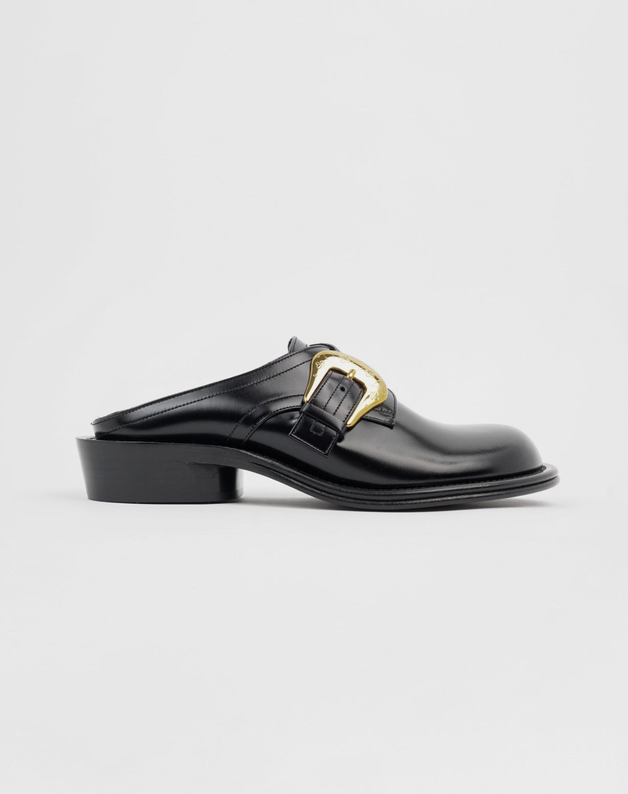 Black Patent Leather Mules. Premium patent leather mules with a gold-tone buckle, perfect for formal and casual wear.