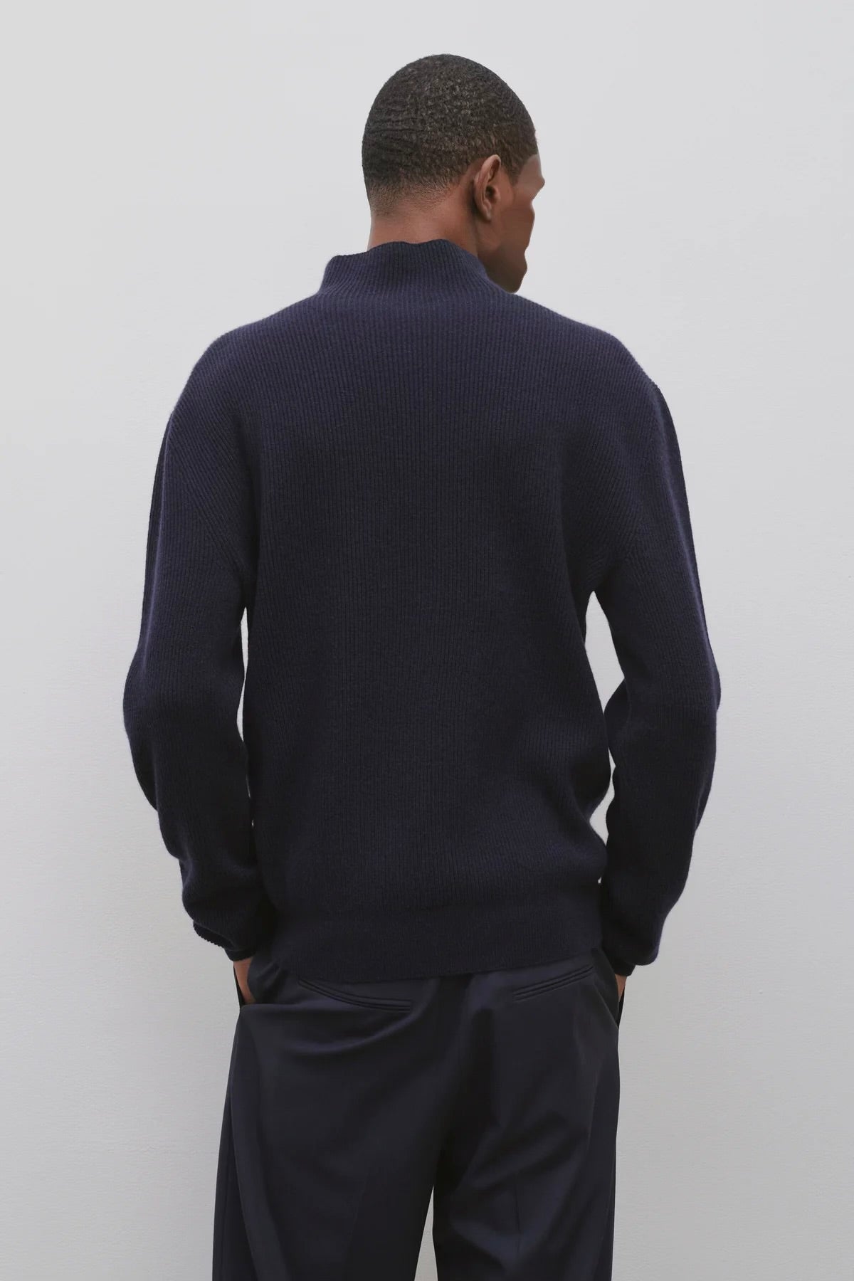 Navy Turtleneck Sweater. Crafted from premium wool, this sleek sweater features a high neckline and a minimalist cross detail, ideal for versatile styling.