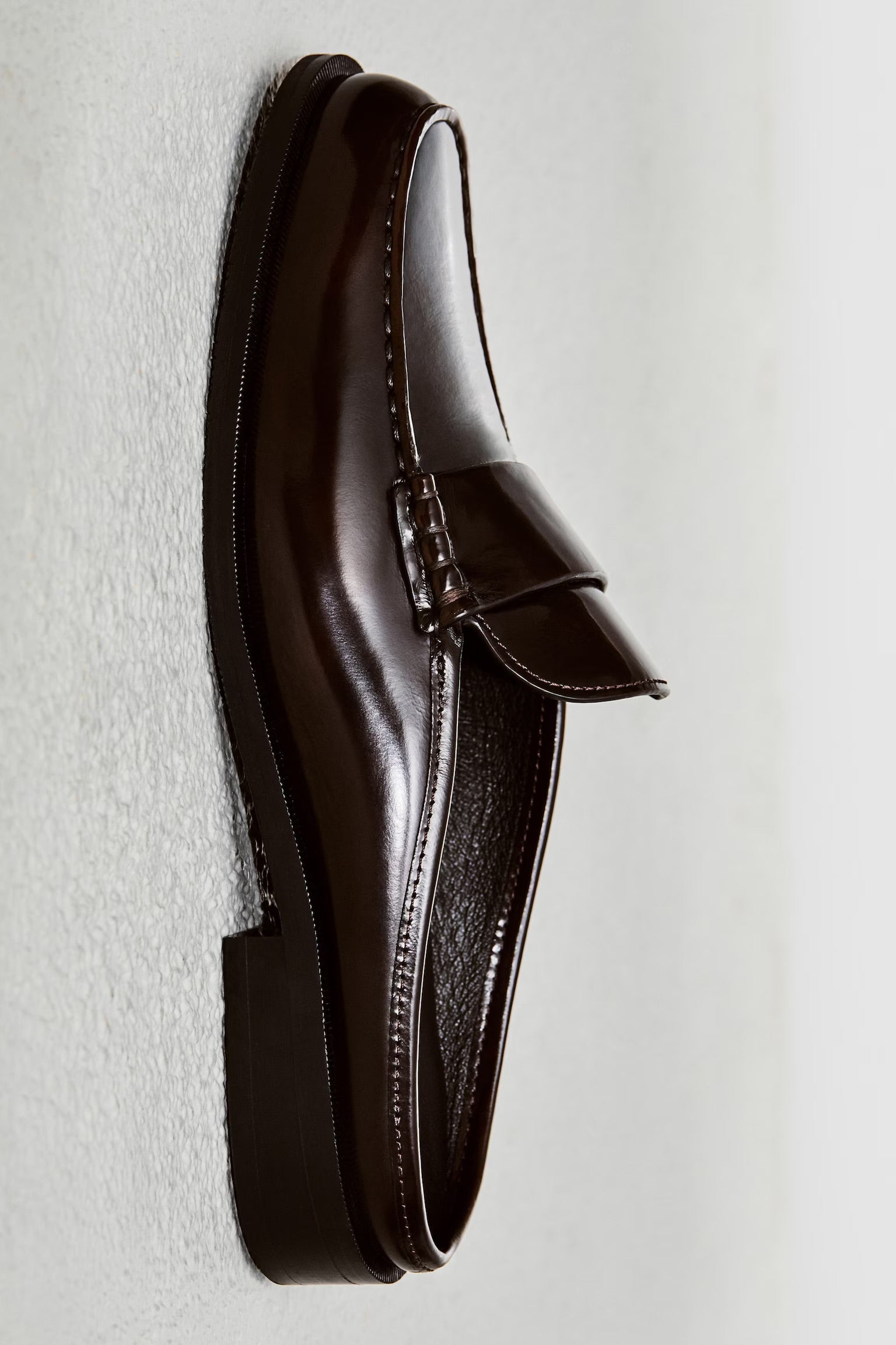 Leather Loafers in Espresso. Handcrafted from polished leather, these loafers feature a sleek, open-black design with a refined strap and subtle stitching. A sturdy sole adds durability, making them a versatile addition to any wardrobe.